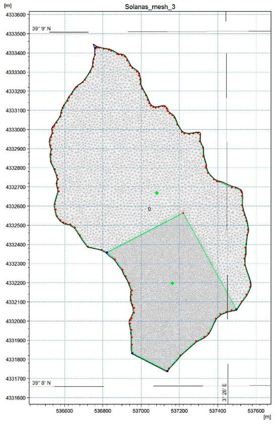 The numerical method, used for the solution of the equations of the 2D problem, uses the implicit finite volume algorithm that allows for larger time steps than explicit methods and for an increase in stability compared to traditional finite difference or finite element methods. To properly model 2D free-surface flows for flood analysis in the pluvial environment of Solanas basin, the 2D Overland module in MIKE+ was activated and coupled with MIKE 21. The domain was represented in the unstructured calculation mesh of Figure 6, with a maximum element area of 10 m2 and a building from the DTM excluded from the mesh.