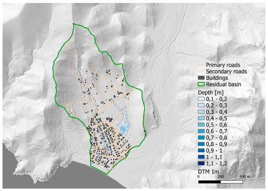 The most sensitive input affecting the 2D flood inundation simulation attributes (depth, extent, and velocity) is the digital terrain model (DTM); thus, this places higher requirements on the quality and resolution of DEMs [45,46]. The results of [43] indicate that flood characteristic simulations exhibit noticeable stepwise changes as DTM resolution varies and the resolution should, preferably, be better than 5 m, as this directly affects the accuracy of flood depth simulation. In this work, a high-resolution DTM with a grid of 1 m from a Laser Scanning LIDAR https://www.sardegnageoportale.it/webgis2/sardegnamappe/?map=download_raster (accessed on 23 January 2025) was selected as the most promising in terms of balance between simulation accuracy and computational times. In the Sardinia region, residual basins are GIS elements contained in the latest update of the information layer of the Regional Geo-topographic database at 1:1000 scale (Figure 5).