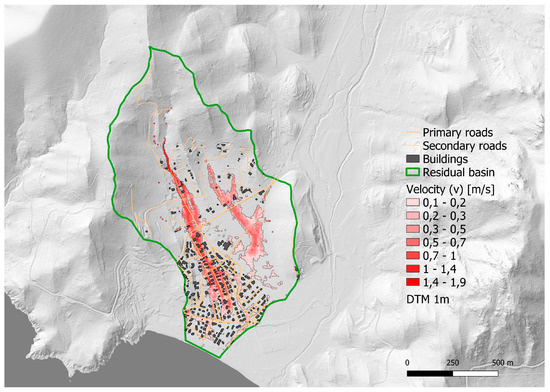 Figure 7 and Figure 8 show the results of the numerical model in terms of the water depth and current velocity fields in the flooded portions (wet cells of the hydraulic model) from the surface runoff formed in the Solanas residual basin. The analysis allows us to clearly identify the main characteristics of the urban flood. Comparing the fields of depth (h > 0.1 m) and velocity (v > 0.1 m/s), the latter is significantly wider (+72%), showing that a large part of the flooded area has a current velocity with very low depth; in about half of these cells, the current velocity is higher than 0.5 m/s. The flood propagation is clearly defined along a NW-SE direction in two approximately parallel paths, and the western in the urban area runs along the main street of Solanas, hitting the buildings on both sides with a speed largely exceeding 1.5 m/s, and the eastern crossing a rural area with lower velocities (v < 0.5 m/s) and higher depth causes flooding in a depressed area of the countryside. Maximum values of depth and velocity in the entire residual basin are dmax = 0.97 m and vmax = 1.90 m/s.