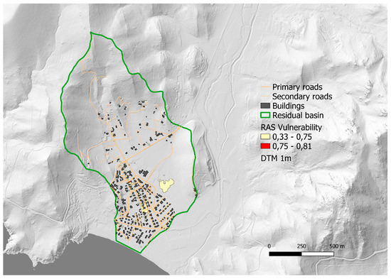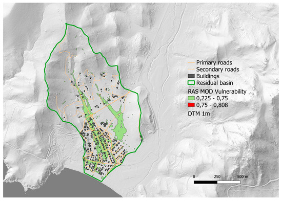 Preserving the original methodological approach, in the entire portion of the basin where the modified RAS model (RAS_MOD) is applied, there is a vulnerability (A = AV = 97,825 m2). The area in which conditions of vulnerability for the person arise increases significantly by 655%. Therefore, in the face of a substantial invariance of the values of maximum vulnerability and standard deviation, the average value of vulnerability decreases by about 27%. The fact that the area with vulnerability increases sixfold appears in Figure 11, where both NW-SE routes present vulnerabilities in a large part of their development while the terminal areas (the roundabout in the urban area and the depressed area in the peri-urban area) occupy significant portions of the territory, defining those areas as unsafe for pedestrians.