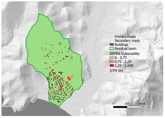 The comparison between the spatial distributions of vulnerability values assumes a planned significance when associated with the following classes developed by [38,39] (Table 2). The RAS classification uses a threshold of Vp equal to 0.75 and the municipalities shall introduce restrictions on building rights only in those parts of the urban and peri-urban (Hi*) areas in which Vp is higher than 0.75 (high in Table 2). In the DEFRA classification, three classes of vulnerability are defined above the Vp threshold of 0.75, each for a different group of people effectively at risk (i.e., for some (children) for most, and for all).