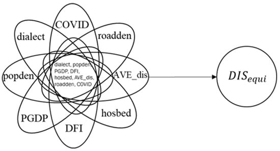 Factors that have an impact on regional mobility can constitute antecedent conditions for the distance equivalence of an SIP policy. The first is pandemics and health-related factors. Pandemics are thought to have an impact on mobility. Related studies have demonstrated that the number of confirmed cases during a pandemic has a key influence on mobility [4,38]. This study uses the number of confirmed COVID-19 cases in each city as one of the antecedent factors (this variable is expressed as COVID-19). Sanitary conditions are also thought to affect mobility [39,40,41]. This study uses the number of hospital beds as an indicator of health conditions (denoted as hosbed). Furthermore, Urban economic development status is an important factor influencing mobility during pandemics [42]. Herein, we use GDP per capita as an antecedent variable (denoted as PGDP), which provides support conditions for people to move. In addition, we use foreign direct investment as an antecedent variable (denoted as DFI), which captures the degree of outward orientation of the city’s economy and is an important factor influencing mobility [43,44]. Population underpins urban mobility [45]; we use population density (popden) to represent the population base (denoted as popden). Dialects are recognized as important factors influencing population movement during pandemics, with people preferring to move to culturally similar areas [4]. With reference to the relevant literature [46], we use dialect diversity as the antecedent variable (denoted as dialect). Finally, distance and transportation are indicators that are closely related to mobility, with distance being an impediment to mobility [42,47]. We use the average distance from the city to other cities as an indicator (denoted AVE_dis). Better transportation facilities tend to compress spatial distances [48] and enhance mobility. We use road network density as an indicator in this study (abbreviated as roadden). FsQCA analyzes the effect of the antecedent variable configuration on the outcome variable. The analytical model is constructed on the basis of existing theories and the abovementioned analysis, as shown in Figure 1.