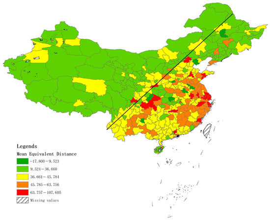 Spatial Distribution of the Distance Equivalence of the SIP Policy. Note: Basemap and administrative boundaries: NGCC, National Fundamental Geographic Information Database, 2020 (WGS84). Hu line drawn by authors.