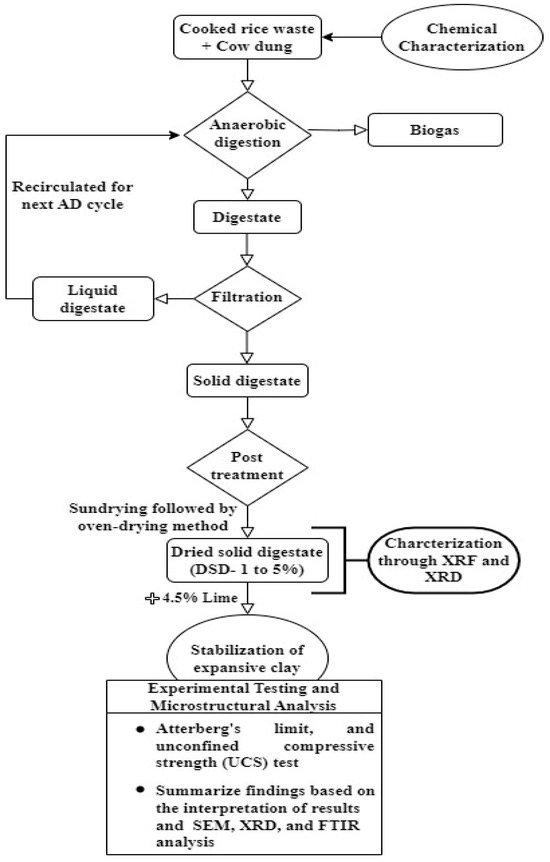 Based on the application of digestate discussed and considering the research gap, this study focuses on utilizing solid digestate as a secondary additive along with the initial consumption of lime (ICL) for expansive soil stabilization. Initially, the digestate was collected through anaerobic digestion of cooked rice waste (CRW) in a lab-scale method. A solid–liquid separation method is adopted to separate the digestate into liquid and solid portions. The solid digestate is then dried and added as a secondary additive to clayey soil along with the ICL to enhance soil strength. To conduct the experimental part, the samples were prepared with DSD contents ranging from 1% to 5%, along with 4.5% lime. Then the tests were performed on both untreated and treated clay after different mellowing periods to evaluate the influence of dried digestate on enhancing the index and mechanical properties of the clayey soil. Additionally, mineralogical, structural, and chemical analyses were performed using XRD (Empyrean, Panalytical, The Netherlands), SEM (EVO18, CARL ZEISS, Jena, Germany), and FTIR (IRAffinity-1, Shimadu, Japan) techniques. The combined findings confirmed the potential of DSD-lime treatment to improve soil performance for geotechnical applications and also contribute to sustainable land management by reducing waste and minimizing environmental impact.