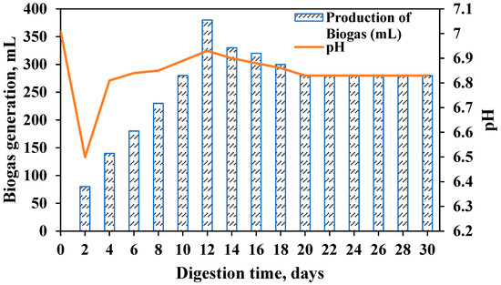 Two separate setups were prepared for the degradation process to facilitate biogas production. Of the two digesters, one was designated for measuring the volume of gas produced using the water displacement method, and the other was utilized for collecting gas samples for composition analysis. The digesters were manually shaken twice daily to promote homogeneity. Gas measurements were recorded at 24 h intervals. Biogas production was monitored over 30 days. The most effective methane synthesis during anaerobic digestion occurs when the system’s pH remains between 6.5 and 7.5. During the experiment, the pH was maintained consistently above 6.5 to create favorable conditions for microbial activity [52,53]. The changes in pH and biogas production throughout digestion are depicted in Figure 3.