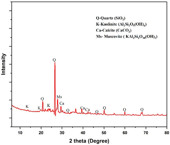 The diffraction pattern of DSD is shown in Figure 5. It displayed the presence of a crystalline phase, accompanied by an amorphous peak with a small hump. The predominant minerals found in DSD are Quartz (Q), Calcite (Ca), and Kaolinite (K). According to literature, the diffraction angles at 2θ = 26.5, 32.9, 40.2, 45.9, 50.1, 60, and 68.4° were referenced as quartz (SiO2), the observed peak at 2θ = 29.5, 39.5, and 42.3° were identified as Calcite (CaCO3), whereas the other peak formed at 27.9° referred as muscovite (KAl3Si3O10(OH)2) [73,74,75,76].