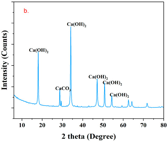 The mineral composition of the clay and lime was examined using X-ray diffraction, with the resulting XRD profiles presented in Figure 6a,b. The analysis revealed that the clay consists of quartz (Q), kaolinite (K), and illite (I) as the main mineral phases. These phases were identified by comparing the observed peaks in the XRD patterns with those reported in previous studies. Peaks observed at 2θ values of 20.6°, 26.9°, 50°, and 68.1° correspond to quartz, while peaks at 27.7° and 42.4° indicate the presence of illite, and a combination of kaolinite–illite–quartz, respectively [81,82]. The observed minerals affect the soil’s chemical and physical properties, including its swell-shrinkage behavior and cation-exchange capacity. According to Supandi et al. (2019), the findings revealed that illite’s presence increases natural moisture content, void ratio, and wet density while reducing cohesion, friction angle, and strength of clay materials [83]. The XRD pattern of lime (Figure 6b) shows a higher intensity peak corresponding to calcium hydroxide and a lower intensity peak corresponding to calcium carbonate, indicating that calcium hydroxide is the dominant mineral phase in the lime sample.