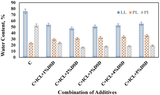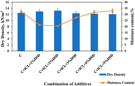 ICL causes clay particles to flocculate, resulting in the formation of coarser aggregates, which decreases water retention and lowers LL. Cementitious products are created when pozzolanic reactions are triggered by the lime’s reaction with the clay and DSD. These substances stabilize the clay and reduce its plastic behavior, contributing to the PI decrement [85]. The combined effects of flocculation, structural change, and decreased water adsorption improved the clay’s overall stability and workability. This is due to the addition of minor DSD and ICL, which lowers LL and PI [86].