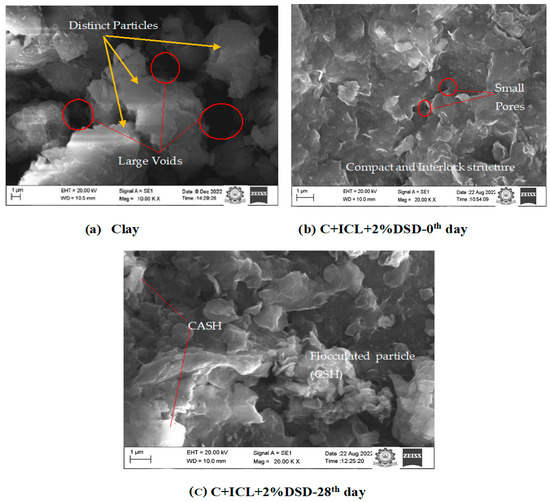 Figure 10 depicts the microscopic image of a stabilized clay containing 2% DSD + ICL after 28 days of curing. This illustrates the microstructural alterations in the DSD-lime-supplemented clay matrix due to the progression of the pozzolanic reaction between the clay and additives. As illustrated in Figure 10a, which displays distinct particles in natural clay and indicates the absence of an integrated structure in the clay, this supports the UCS value of 72.43 kPa. After the 0- and 28-day curing periods (Figure 10b,c), the natural clayey soil structure has transformed from a particle-based form into a more compact and interlocked structure due to cation exchange reactions and the formation of CSH and CASH. According to Bagriacik and Guner’s study, the clayey soil’s bearing capacity is increased by multiaxially distributed clusters following the addition of DWTS [95]. Based on Modarres and Nosoudy’s findings, the formation of CSH due to a reaction between the additive and soil resulted in higher compressive strength and California Bearing Ratio (CBR) value [96]. Prior research indicates that the structural transformation of clay particles improves their workability and load-bearing capacity.