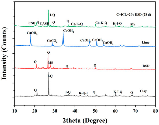 Following the study on the characterization of DSD, it is essential to analyze the properties of clayey soil to understand the behavior and interaction with additives (DSD and ICL). The chemical composition of clay is analyzed through XRF and reported in Table 2. The result reveals that the main constituents, SiO2 and Al2O3, highly influence the reactivity of clay when it is mixed with a suitable activator such as lime and pozzolanic material like DSD. The presence of such components is confirmed through the XRD profile of the clay [79].