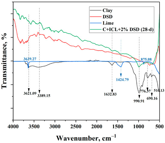 When soil is blended with varying proportions of additives such as DSD with ICL at the optimum water content, chemical reactions occur, producing pozzolanic materials in an alkaline condition. The resultant substances fill the space between clay particles, bond the clay grains, and contribute to strength development [85,94]. The CaO content in DSD and lime (81%) is essential for initiating hydration, which produces Ca(OH)2 when mixed with water. Increased Ca(OH)2 enhances the pozzolanic reaction for CSH (calcium silicate hydrate) and CASH (Calcium Aluminum Silicate Hydrate) formation. This process effectively modifies the soil structure and significantly improves the strength of clay.