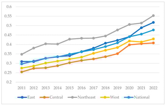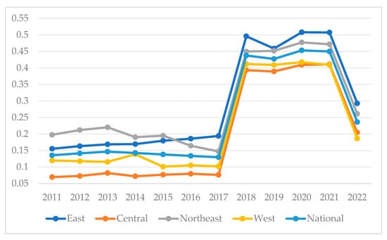 The development levels of agricultural green development and farmers’ income quality in 31 provincial-level administrative regions across China from 2011 to 2022 were measured by using the entropy weight method. The following is an analysis of the overall temporal evolution trend, regional differences, and the performance of typical provinces of the two systems. To further clarify regional differences, this study categorized China’s 31 provincial-level administrative regions into four geographical divisions—eastern, central, western, and northeastern—based on the classification standards of the National Bureau of Statistics of China. Specifically, the eastern region includes Beijing, Tianjin, Hebei, Shanghai, Jiangsu, Zhejiang, Fujian, Shandong, Guangdong, and Hainan. The central region includes Shanxi, Anhui, Jiangxi, Henan, Hubei, and Hunan. The western region includes Inner Mongolia, Guangxi, Chongqing, Sichuan, Guizhou, Yunnan, Shaanxi, Gansu, Qinghai, Ningxia, Xinjiang, and Tibet. The northeast region includes Heilongjiang, Jilin, and Liaoning.