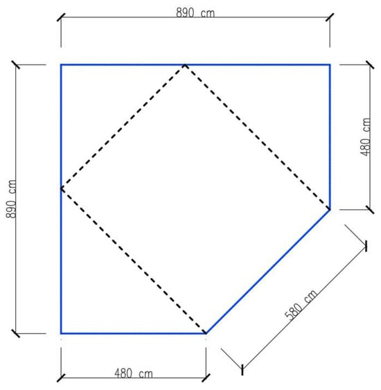 Sketch of the classroom used for the experiment (with blue—perimeter of the room, with dotted line—experimental work zone).