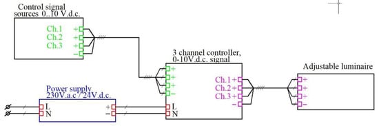 The original classroom lighting system was a fluorescent one, with each luminary equipped with 2 tubular fluorescent lamps of 120 cm with an approximate electrical power of 36 W. In order to perform the study, we have equipped the room with a system containing 14 luminaires, each formed by 3 linear LED strips, mounted inside rails. Each of these 3 LED strips constitutes a separate channel (Ch1, Ch2, and Ch3), and the luminous flux of similar channels of all luminaries can be controlled simultaneously, i.e., Ch1 of all luminaires and so on. Luminaires are powered by a controller, which in turn receives the control signals from three 0…10 V.d.c. signal sources, one for each channel (see Figure 2).