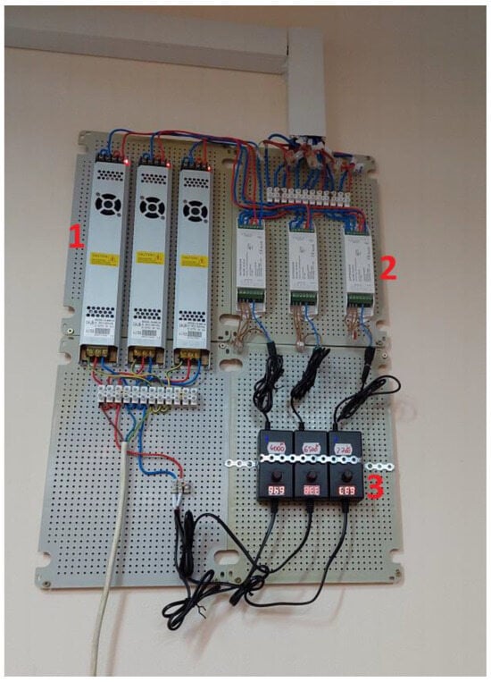 The control panel of the LED lighting system (1—power supplies; 2—controllers; and 3—control signal sources).