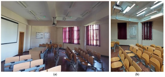 The classroom before (a) and after (b) the installation of the adjustable LED lighting system. In Figure (b), both the fluorescent and LED systems are on, the fluorescent lamps are mounted on the ceiling, and the LED lamps are suspended.