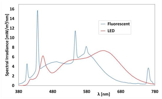 The absolute spectral power distributions of the two systems are presented in Figure 5. In order to measure the photometric quantities, we have used a LISUN LMS-6000 handheld spectroradiometer (typical measurement accuracy: ±1.0%, Spectral Range: 380–780 nm, and Spectral Resolution: 1 nm).