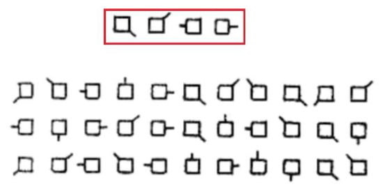 The subject was presented with a large matrix of symbols arranged in rows and columns (23 lines and 20 columns in our version [57]), typically very similar in appearance (a fragment is presented in Figure 6). They must identify and mark some specific target symbols, presented at the top of the worksheet, among a large field of distractors. For our version, the test was limited to exactly 4 min, after which a stop signal was given, and the subjects must mark the last analyzed symbol. After this, the score was calculated: