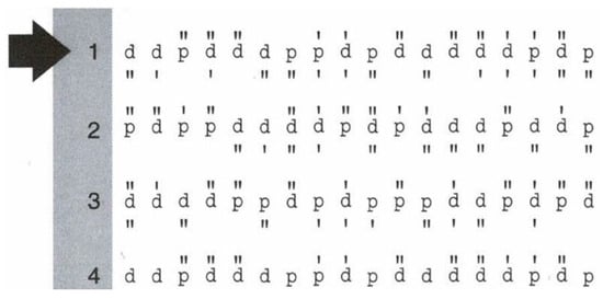 The subject is given a paper with 14 lines of characters (letters) — a fragment is presented in Figure 7. Each character is either a “d” or a “p”, accompanied by one to four small dashes above or below it. The subjects must scan each row and mark only the letters “d” with two dashes (either above, below, or one on each side) among a large field of distractors, which include the letter “p”, with or without dashes, and letter “d”, with 1, 3, or 4 dashes. The students are allowed exactly 20 s to complete a line, encouraging both speed and accuracy.