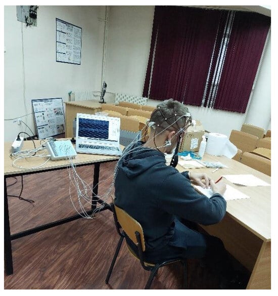 For the EEG analysis, we have used a Contec KT88 electroencephalograph with 16 channels, which uses Ag/AgCl wet electrodes that can be placed on a mesh cap. The electrodes were measured relative to a reference electrode attached to the ear lobe. The EEG signal sampling frequency was 100 Hz. The typical setup of the EEG experiment in the classroom used for the study is illustrated in Figure 8.