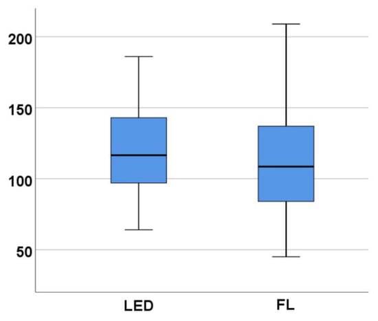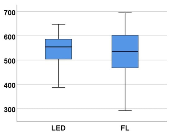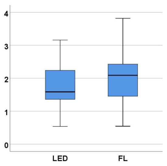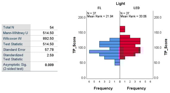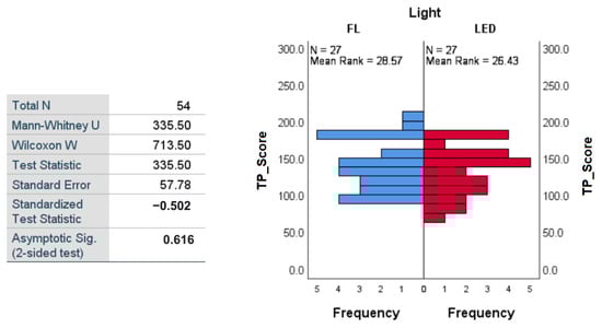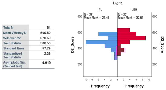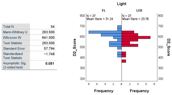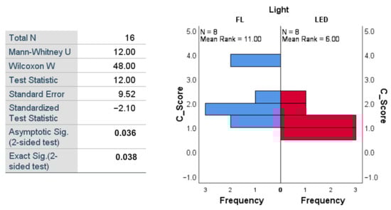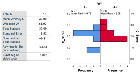 The results of the Mann–Whitney tests are presented in Figure 10 for Phase 1 and in Figure 11 for Phase 2. In Phase 1, the test indicated a significant difference between C_Scores depending on the type of light: U = 12.00, Z = −2.10, p = 0.038 (<0.05, significant), and the effect size r = 0.53. Participants exposed to LED light had significantly lower C_Score scores (mean rank = 6.00) than those exposed to fluorescent light (mean rank = 11.00), suggesting a better level of concentration (inverse of C_Score) when performing the task under the influence of LED light. In Phase 2, the test no longer indicated a significant difference between the two groups of subjects who performed the task under the two lighting conditions (p = 0.834), the mean ranks being very close: 8.75 for fluorescent and 8.25 for LED light.