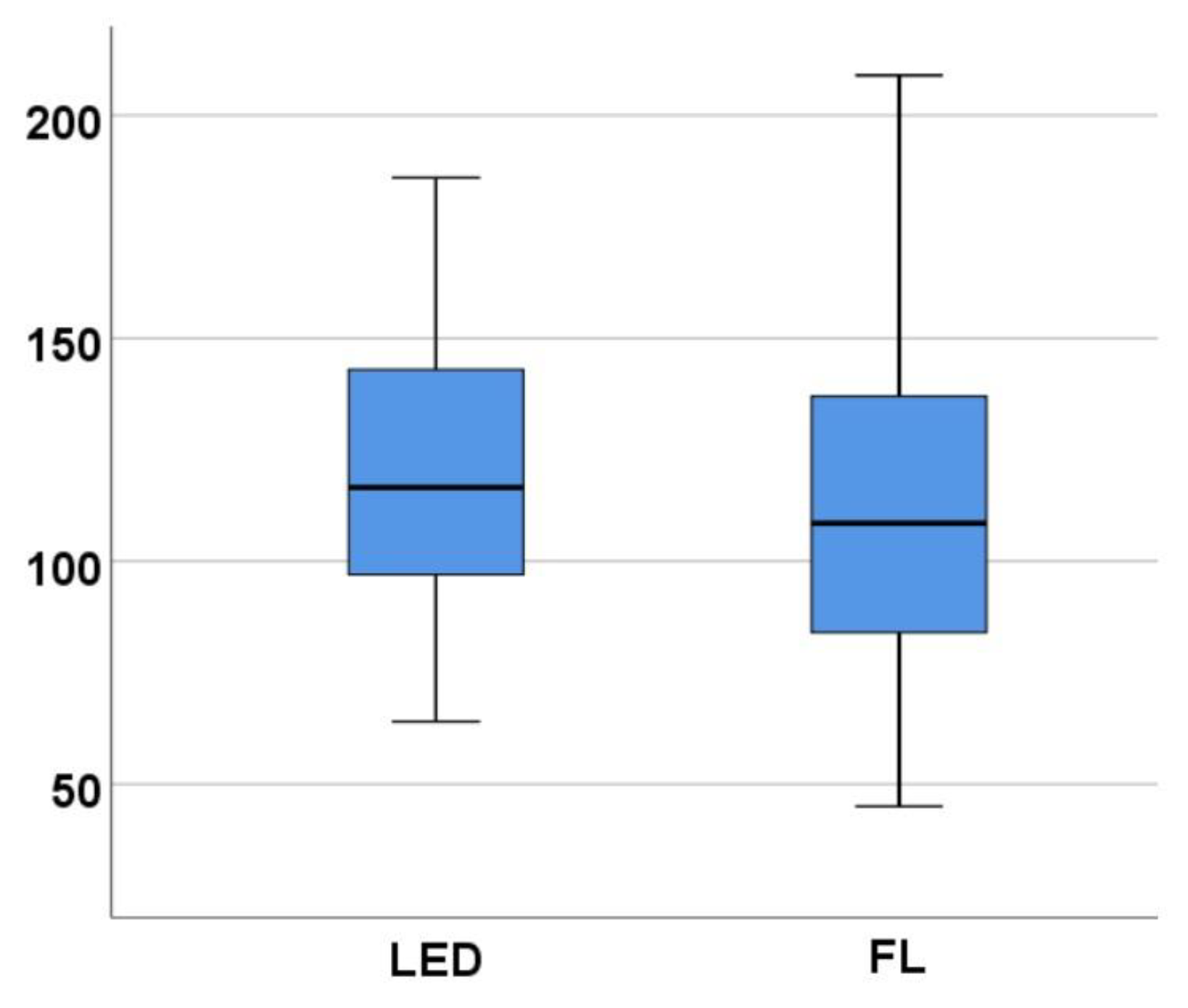 The Wilcoxon analysis revealed, across all three measures, a slight performance advantage for LED light, although this difference did not reach statistical significance.