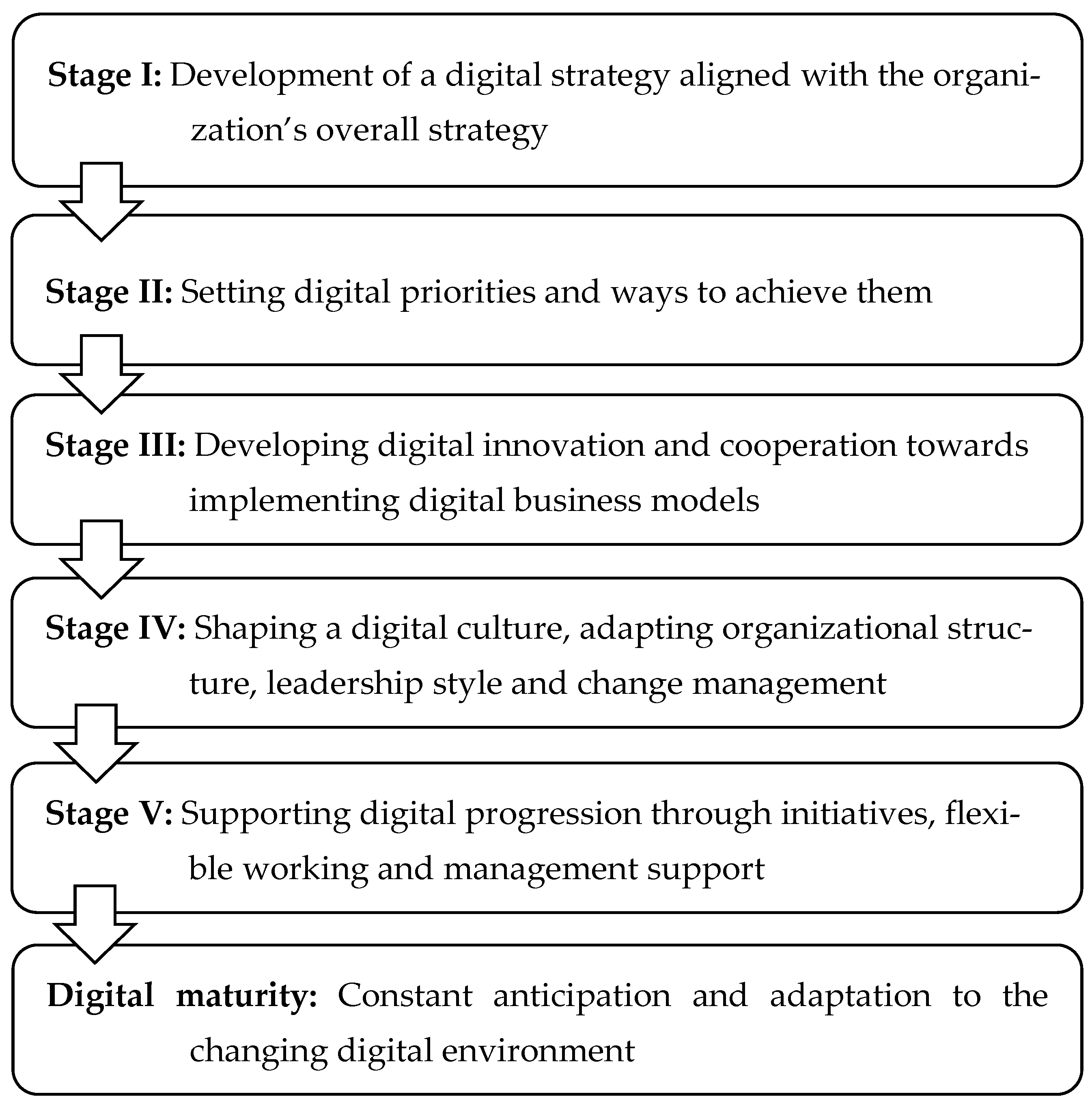 - Berghaus, S.; Back, A. Stages in Digital Business Transformation: Results of an Empirical Maturity Study. In Proceedings of the 10th Mediterranean Conference on Information Systems (MCIS 2016), Paphos, Cyprus, 4–6 September 2016; p. 22. Available online: https://aisel.aisnet.org/mcis2016 (accessed on 10 July 2025).