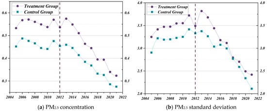 Yit is the explained variable in the model (1), representing the concentration and standard deviation of PM2.5 for city i in year t. Treatedi is a grouping variable, taking the value of 1 if city i belongs to the treatment group and 0 if it belongs to the control group; Postit is a treatment period dummy variable, taking the value of 1 if city i is in the NIPMC in year t, otherwise 0. Controls is the set of control variables for this paper. , and are the city fixed effects, time fixed effects, and random error term, respectively.