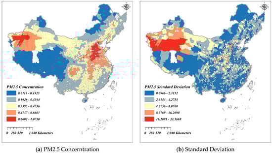 The data on PM2.5 concentrations utilized in this study are sourced from the Atmospheric Composition Analysis Group, which integrates aerosol optical depth data from multiple satellites such as MODIS, VIIRS, MISR, and SeaWiFS using various retrieval methods including Dark Target, Deep Blue, and MAIAC, combined with GEOS-Chem simulation data [65,66]. The relative uncertainties determined by ground-based sun photometer observations (AERONET) are used for geophysical estimations, accounting for most of the variability in ground-level PM2.5 measurements and producing estimated values of global and regional PM2.5 concentrations. Building on this, ArcGIS is used to aggregate the raster surfaces into county-level annual averages of PM2.5 across China. The PM2.5 standard deviation is then computed from the daily observations within each year (365/366 days) using the conventional formula, capturing the intra-annual variability-and hence the uncertainty—of particulate matter concentrations at the county level.