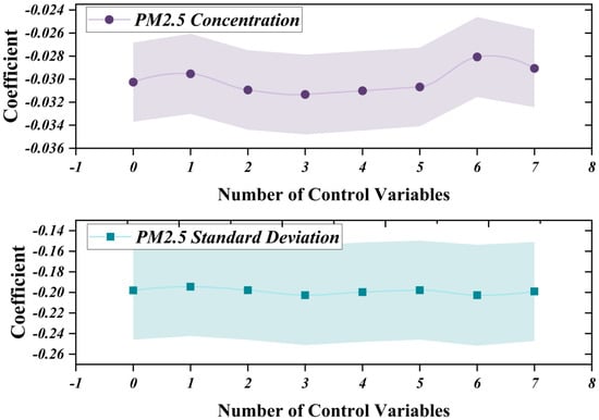 Columns (1) and (5) of Table 2 report the regression results without control variables, showing NIPMC coefficients of −0.03 and −0.198, respectively, both significant at the 1% level. Subsequent columns report results with progressively added control variables, where changes in coefficient magnitude are minor, and the level of significance remains largely unchanged. Figure 5 illustrates this more clearly, indicating that the added control variables have minimal impact on the stability of the model, thus affirming the robustness of the estimated results. The gradual inclusion of control variables in the regression analysis supports the core hypothesis of the study: NIPMC significantly reduces PM2.5 emissions and its variability. Hence, Hypothesis 1 is validated.