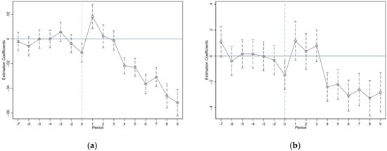 The parallel trends test is a crucial step in the Difference-in-Differences (DID) model, utilized to verify whether the treatment and control groups followed similar trends prior to the intervention [61,69]. This test ensures that, in the absence of any intervention, the outcomes for both groups would have evolved in a similar manner over time, thereby rendering the estimated effects of the intervention more credible [70]. The parallel trends test typically employs the Event Study Method, which involves comparing the trends of the treatment and control groups at various time points before and after the treatment to assess their parallelism. Specifically, the parallel trends test is conducted by observing whether the coefficients at various pre-treatment time points significantly deviate from zero. If these coefficients are not significant, it indicates that the two groups exhibited parallel trends before the treatment, thus satisfying the prerequisite assumption of the DID model. Drawing from existing literature [71,72,73], this study employs the Event Study Method for conducting the parallel trends test and sets up the following model: