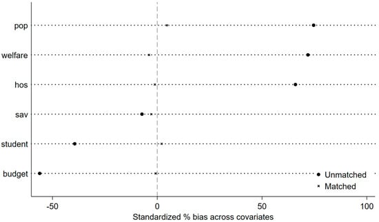 The propensity score matching method is a statistical technique used to control for sample selection bias in non-randomly grouped samples [75,76]. By calculating the probability of each sample receiving treatment and matching similar samples in treatment and control groups, its primary function is to enhance the accuracy of causal inference and reduce the impact of potential confounding factors. Types of propensity score matching include caliper matching, radius matching, kernel matching, and linear regression matching. This paper primarily employed nearest neighbor matching for propensity score matching, ensuring the similarity of characteristics between treatment and control groups after matching. Figure 7 reports the matching results of the nearest neighbor matching method, where the post-matching % bias is observed to be close to the zero axis, indicating successful matching.