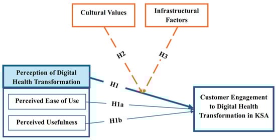 Despite the extensive research on digital health adoption, relatively less research has been conducted to Saudi Arabia [30], i.e., customer attitudes and infrastructural-cultural differences’ impact on digital health adoption [25,31]. Research has largely focused on technological advancements and policy-oriented adoption, rather than human-related factors and locally relevant factors in driving effective uptake of digital healthcare [32]. By combining TAM constructs with infrastructural and cultural variables as a moderator, this research fills the gap by evaluating how perceived ease of use and perceived usefulness propel customer engagement in various healthcare contexts [33].