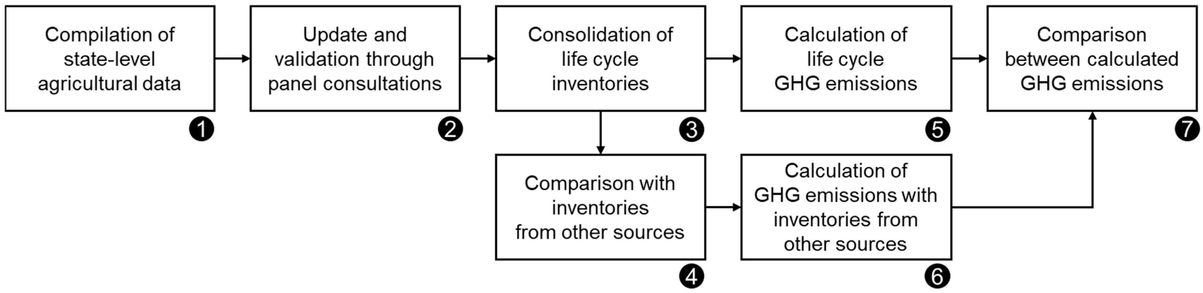 The methodological steps to generate the agricultural inventories and calculate the life cycle GHG emissions of the three crops investigated are presented in Figure 1. The approach adopted also includes updating and validating the data obtained, as well as comparisons with results from other sources. We describe each step in detail in the following sections.