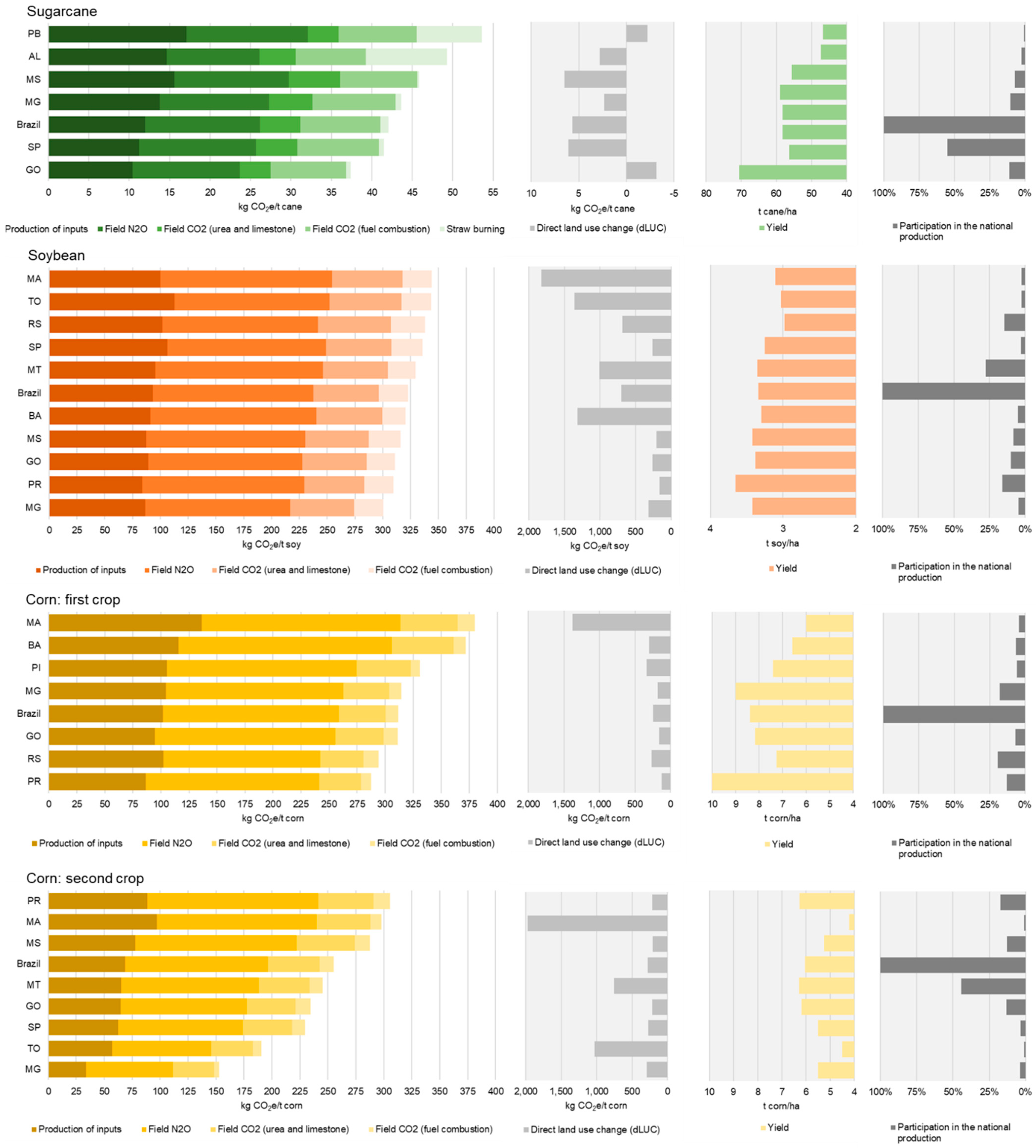 This study had two main objectives. First, we compiled representative agricultural inventories of the three major crops cultivated in Brazil (i.e., corn, soybean, and sugarcane) at the state level. The inventories were built primarily using data provided by farmers and biofuel producers from the various states of the country, with supplementary information retrieved from statistical reports and the scientific literature. Second, we used the inventories to calculate the GHG emissions associated with the production systems of these crops. The results can be valuable as references for feeding life cycle inventory (LCI) databases and developing state-specific emission factors for biofuels in Brazil produced from the investigated crops for use in international low-carbon schemes. To the best of our knowledge, this is the first effort in a single study to obtain representative inventories using primary data and GHG emissions at the state level in Brazil for the three main crops produced in this country.