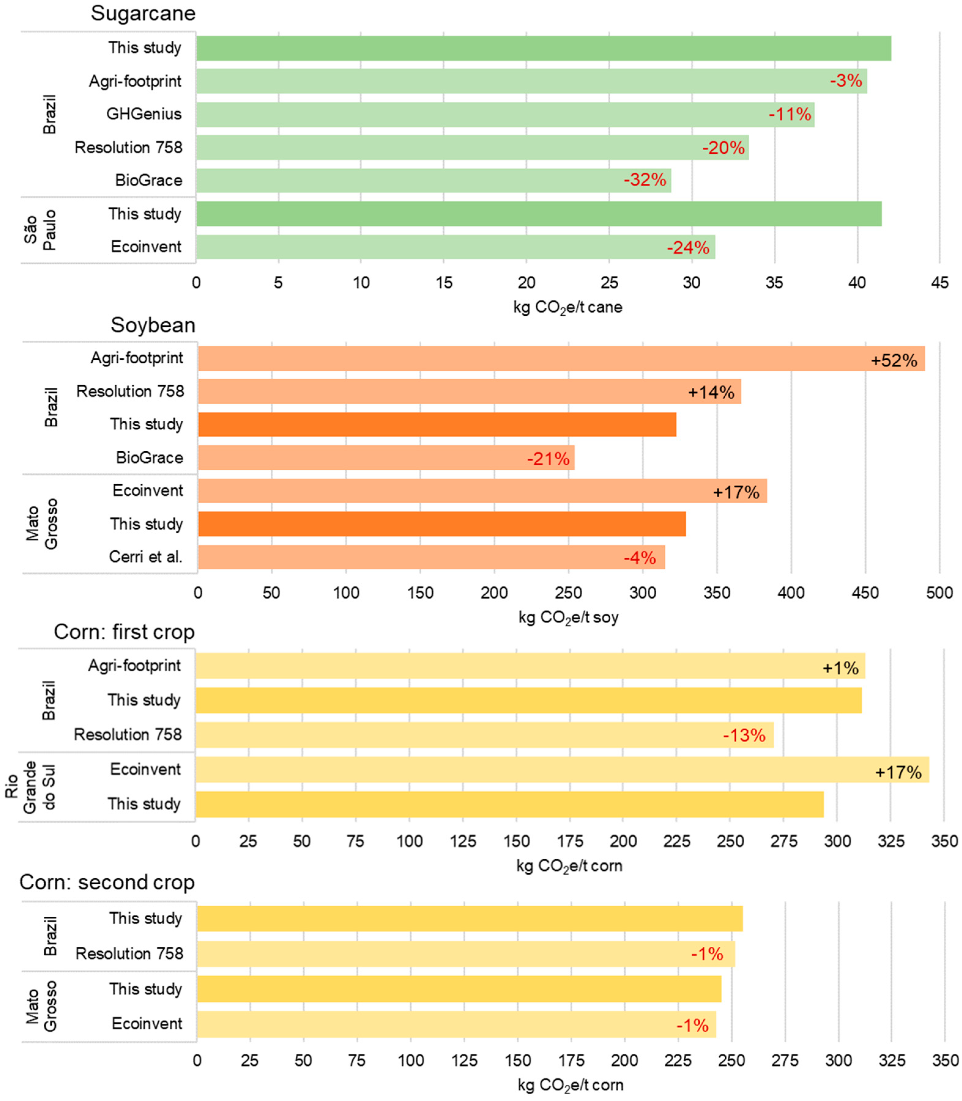 We compared the inventories compiled in our study with data from the national and state-level inventories of the three crops investigated, using relevant commercial and independent sources: The Resolution 758 [34], GHGenius [22], and BioGrace [52] models; the Agri-footprint v6.3 [53] and Ecoinvent v3.9.1 [38] databases; and a study on GHG emissions from soybean production in Brazil [54]. Agri-footrint and Ecoinvent are largely used in studies on the environmental impacts of food products and biofuels, especially within international low-carbon fuel standards and regulatory schemes.