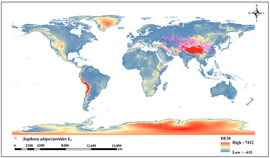 2.3. Predicting Suitable Growing Areas of Sophora alopecuroides L. Globally Using the MaxEnt Model
