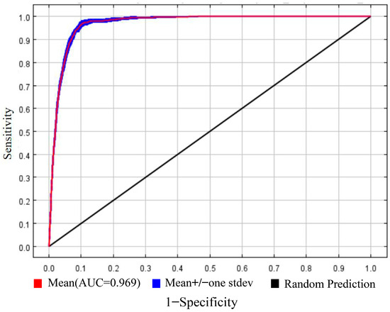 In the context of model performance assessment, the Area Under the Receiver Operating Characteristic Curve (AUC-ROC) is utilized as a quantitative evaluation metric. The calculation principle of this method is based on the matching degree between the prediction probability of the model and the real distribution. The AUC value range is 0–1, and the higher the value, the stronger the discrimination ability of the model [35]. The MaxEnt model automatically generates the ROC curve and calculates the corresponding AUC value via its built-in algorithm. The quantitative classification criteria are as follows: AUC > 0.9 indicates an excellent level of model discrimination [36,37].
