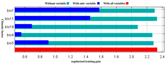 Integrating three complementary metrics—percent contribution, permutation importance, and jackknife unique gain—this study first screened the climatic determinants of S. alopecuroides L. suitability at the global scale. Annual mean temperature (Bio1) emerged as the single most influential descriptor, accounting for 25% of model contribution and 54.7% of permutation importance. Maximum temperature of the warmest month (Bio5) and precipitation of the warmest season (Bio18) completed the top triad, whereas temperature seasonality (Bio4) was flagged as the key proxy for thermal instability. Jackknife (Figure 3) resampling further revealed that Bio1, Bio5 and mean temperature of the coldest quarter (Bio11) produced the largest independent information gain, corroborating the pre-eminent role of temperature axes in delimiting the species’ potential range [18].