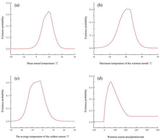 Response curve of existence probability and environmental variables of Sophora alopecuroides L. (a) Mean annual temperature/°C, (b) Maximum temperature of the warmest month/°C, (c) The average temperature of the coldest season/°C and (d) Warmest season precipitation/mm.
