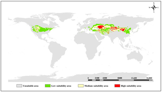 Based on the spatial simulation of contemporary climate scenarios, the total suitable habitat area is 12,879,100 km2, accounting for 8.64% of the total land area in the world. The core distribution area is concentrated in the hinterland of Eurasia at 30–50° north latitude, including the transition zone from the arid region of Central Asia to the monsoon region of East Asia. The secondary distribution areas are scattered in discontinuous patches in the west of the Great Plains of North America, the Western Asia plateau, the Mediterranean Sea, and the Black Sea coast. To sum up, S. alopecuroides L. presents a continuous core belt of “Central Asia Northwest China Mongolia Plateau”, and the rest of the countries are mostly marginal or sporadic. Among them, the high fitness area is 2,208,300 km2, accounting for 17.14% of the total fitness area. It is mainly distributed in Northwest China (north of the Tianshan Mountains in Northern Xinjiang, the Tacheng region, the Changji Hui Autonomous Prefecture, north of the Tarim Basin in southern Xinjiang, north of central Gansu, and north of Ningxia in Southwest China), west of North China (west of Inner Mongolia), south of Mongolia, east and west of Kazakhstan, and a small amount is distributed in the Midwest of the United States, eastern Turkey, northwest Iran, and Southeast Afghanistan, showing a discontinuous distribution as a whole. The moderately suitable area is 4,757,000 km2, accounting for 36.94% of the total suitable area. It is mainly distributed in Northwest China (Altay, Xinjiang, Tarim Basin, central Qinghai, western Gansu, and central Ningxia), North China (western Inner Mongolia), southern Mongolia, a large area of central Kazakhstan, eastern Ukraine, and part of the Russian region bordering it. The overall distribution is massive. The low suitable area is 5,913,800 km2, accounting for 45.92% of the total suitable area. It is mainly distributed in the central and western United States, the southwest region of the Great Lakes, the northern coastal region of the Mediterranean, the northwestern coastal region of the Black Sea, the northern and southern regions of Kazakhstan, the central and eastern regions of Uzbekistan, the central and northern regions of Turkmenistan, and North China (northern and southern Shaanxi, southern Shanxi, southern Hebei, and central and northern Henan).