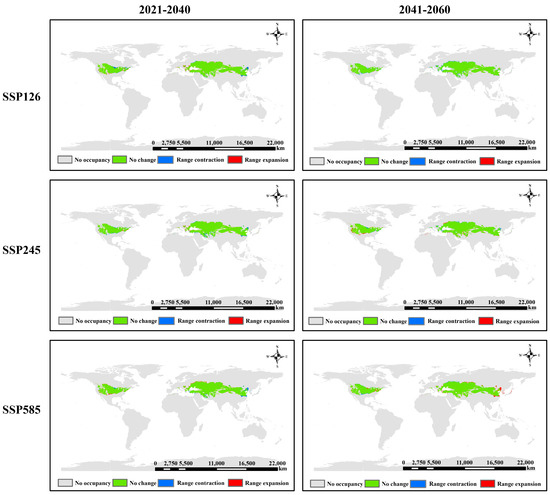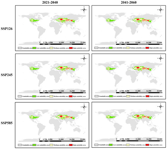 Using the multi-scenario simulation framework (SSP126, SSP245, and SSP585) from the BCC-CSM2-MR climate system, this study compared and analyzed the short-term (2021–2040) and medium-term (2041–2060) spatial distribution response characteristics of S. alopecuroides L. The results (Figure 6) show that the core distribution area of S. alopecuroides L. exhibits significant geographical pattern stability in Eurasia, consistently occupying the transition area between the Central Asian arid zone and the East Asian monsoon region. Notably, the ecological suitability under different emission scenarios exhibits latitudinal gradient differentiation. The response threshold of the suitable area extending to high latitudes, driven by the high-temperature chamber gas emission scenario (SSP585), is notably significant. Compared to the current distribution of suitable areas, the range of low-suitability areas in Central and Eastern Asia expands toward middle- and high-suitability areas, occupying some of these areas. In North America, the range of low-suitability areas expands eastward from 2021 to 2040 and shrinks from 2041 to 2060. The distribution of middle and high fitness areas in Central and Eastern Asia showed an inward contraction trend, while there was no significant change in North America.