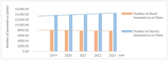 According to statistics, the production of waste mineral oil in China increased from 6.24 million tons in 2013 to 7.317 million tons in 2018 [1]. In recent years, China has produced approximately 7.8 million tons of waste mineral oil annually [2], reaching 8.577 million tons in 2022 [3]. The railway industry is a vital component of the global transportation network, and the maintenance and overhaul of locomotives generate significant amounts of waste mineral oil [4]. With the increasing electrification of the railway system and the implementation of policies such as the ‘Supervision and Management Measures for the Phase-out and Upgrade of Old-Type Railway Diesel Locomotives’ and the ‘Action Plan for the Large-Scale Upgrade of Transportation Equipment’ [5], the number of electric locomotives in operation has been increasing annually, from 13,665 units in 2019 to 14,634 units in 2023. Meanwhile, the number of diesel locomotives in operation has decreased year by year, from 8048 units in 2019 to 7751 units in 2023 [6] (Figure 1). The total amount of waste mineral oil generated has also shown a decreasing trend. However, with the sustained growth of China’s economy, the acceleration of urbanization, and the continuous advancement of infrastructure development, the amount of waste mineral oil generated by the national railway system remains significant and should not be underestimated.