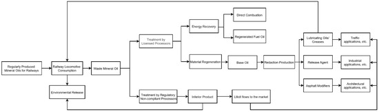 Through research and literature review [30,31,32], the flow process of mineral oil in railways (Figure 6) can be summarized into three main stages: production, circulation, and disposal after waste. The largest source of mineral oil used in railways is petroleum refining enterprises and professional lubricant manufacturers, and it is also used in the maintenance and cleaning of locomotive equipment. The waste mineral oil generated is collected and temporarily stored, then processed and produced by qualified companies. However, due to significant differences in processing technology, the quality varies greatly, and the quantity is difficult to estimate. In some remote areas where regulatory and enforcement efforts are inadequate, waste mineral oil may be sold to unqualified companies, resulting in counterfeit and substandard non-compliant products entering the market. The compliant disposal of waste mineral oil is achieved through disposal and recycling companies, which generate energy value and recycled products that meet the relevant standards before entering the market. The specific disposal method should be selected based on reasonable consideration of indicators such as the oil content, viscosity, pour point (freezing point), flash point, and color of the waste mineral oil. According to the research of Liang Yangyang et al. [16], the mainstream process in China’s waste mineral oil recycling industry is mainly atmospheric and vacuum distillation combined with solvent refining. Hydrogenation refining, molecular distillation, and thin-film evaporation technologies are also used to some extent. In addition, traditional methods such as flocculation, acid–base treatment, and white clay adsorption, as well as end-of-pipe incineration disposal methods, are still used.