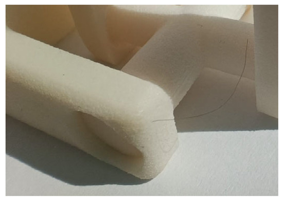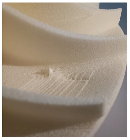 Contamination refers to the presence of foreign inclusions within the part’s material, such as fibres, oxides, or agglomerates of a different powder type [41]. These impurities can come from the working environment or improper material handling. Their presence can reduce the material’s strength, acting as initiation points for micro-cracks or other defects [41]. Rigorous control of the build environment and material purity is essential to prevent this type of defect.