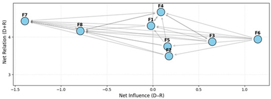 The threshold is commonly applied to exclude minor influences in the total-relation matrix, highlighting only the more meaningful relationships for building the causal map. Any relationship with a value in the total-relation matrix exceeding is deemed significant. In this study, an threshold of 0.255 was determined using Formula (5) based on the total-relation matrix. The selection of the threshold is a crucial step in the DEMATEL methodology as it allows for the distinction between significant and negligible causal relationships. In this study, the α-threshold value was determined by calculating the arithmetic mean of all the elements in the total influence matrix (). This approach is a widely accepted standard in the literature as it serves as an objective filter, ensuring that only influences that exceed the average total effect are retained. Consequently, any relationship with a value in the matrix that is greater than the threshold is considered a significant causal or effect factor. By excluding weaker relationships that could introduce ‘noise’ into the analysis, this method reinforces the validity and clarity of the causal map, allowing us to focus on the most essential interdependencies within the system.