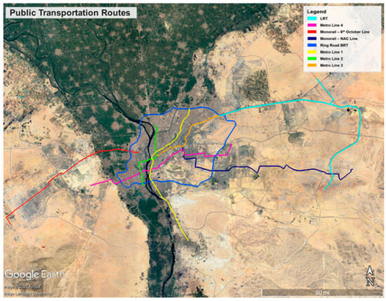 Cairo has an extensive public transport network, including buses, the metro, and microbuses. However, the quality of service is substandard, access to relevant information is minimal, mixed-mode commuting is very hard, and the system is perceived as unreliable and uncomfortable by travelers. Additionally, the transport network is still limited, leading to severe road congestion [4,5]. Since 2017, along with the expansion of the New Administrative Capital (NAC), Egypt has increased its focus on rail-based transportation lines, which can address several shortcomings of the existing system and improve mobility in Cairo. Recent and ongoing projects include an LRT, two Monorail Lines, Metro Line 4, and a BRT (Figure 1).