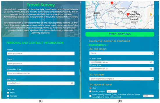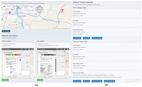 The participant is then guided to select their home location on an interactive map, which dynamically sets a trip to the New Administrative Capital. The map functionality integrates Google Maps API, enabling participants to interact with Cairo’s urban geography. The system does not generate any trip options until the user chooses their home location on the map and clicks the “Show Trip Options” button, as shown in Figure 4a. As said, this feature is critical for simulating real-life trip calculations, as it provides relevant context for the participant, ensuring that the survey captures realistic spatial data for personalized trip simulations and geographic precision for origin-destination analysis.