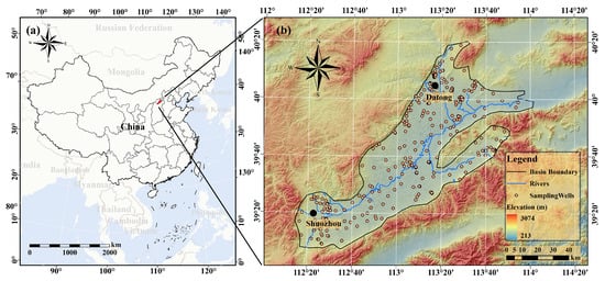 Localization of the study area: (a) localization of China and Datong Basin; (b) Digital Elevation Model of hydrographic boundaries of Datong Basin, and location of sampling wells.
