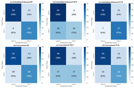 Confusion matrix: with satellite embeddings—(a) RF model, (b) ANN model, and (c) SVM model; without satellite embeddings—(d) RF model, (e) ANN model, and (f) SVM model. The values on the top left, bottom right, top right, and bottom left represent the number of TPs, TNs, FPs, and FNs, respectively.
